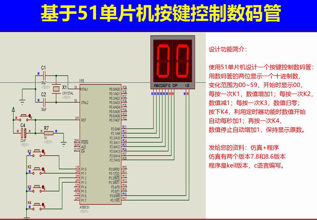 数码管:用数码管的两位显示一个十进制数,变化范围为00~59,开始时显示00,每按一次K1,数值增加1;每按一次K2,数值减1;每按一次K3,数值归零;按下K4,利用定时器功能时数值开始自动每秒加1;再按一次K4,数值停止自动增加1,保持显示原数。