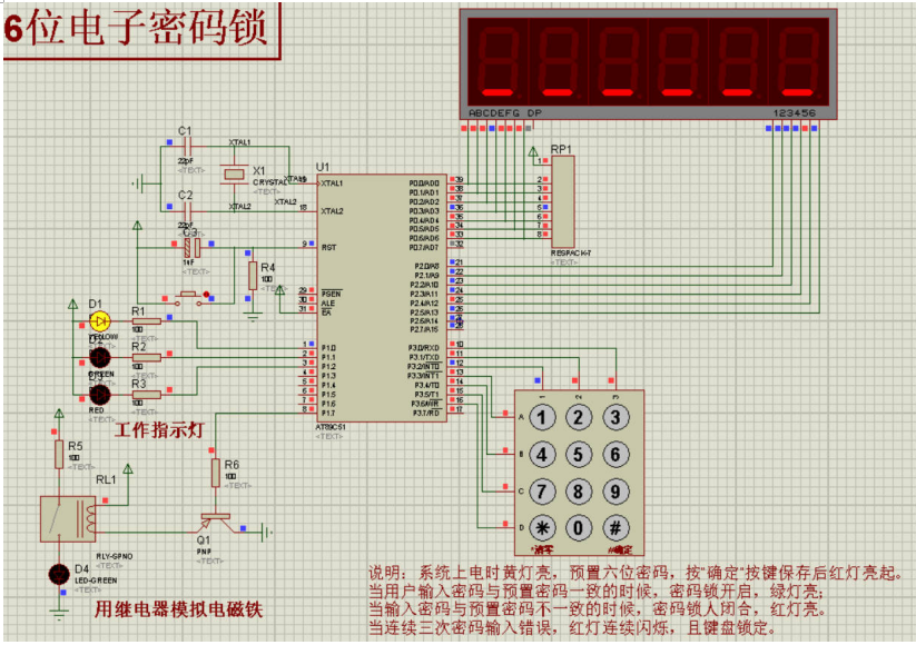 使用51单片机设计一个6位数字密码锁,可以通过3*4矩阵按键输入密码,然后在数码管上显示。当系统上电时黄灯亮,通过矩阵按键预置六位密码,按“确定”按键后红灯亮起,此时密码保存。当用户输入密码与预置密码一致的时候,密码锁开启,绿灯亮,这里使用一个LED指示灯模拟电磁锁;当输入密码与预置密码不一致的时候,密码锁关闭,红灯亮。当连续三次密码输入错误,红灯连续闪烁,且键盘锁定,此时只能关闭仿真,然后再打开仿真才能解锁。