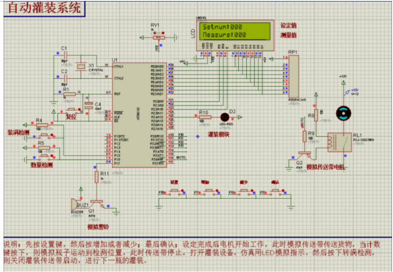 使用51单片机设计一个自动灌装控制器,功能如下:通过LCD显示设定值和测量值。可以通过设定灌装数量,使用直流电机模拟传送带。使用一按独立按键模拟光电检测,每按一次检测到一个货物,检测到货物之后电机停止,表示货物到指定位置。此时打开灌装设备,仿真用LED模拟指示。然后按下装满检测(同样使用独立按键模拟液位检测),则关闭灌装,传送带启动,进行下一瓶的灌装。灌装完成后通过蜂鸣器报警。