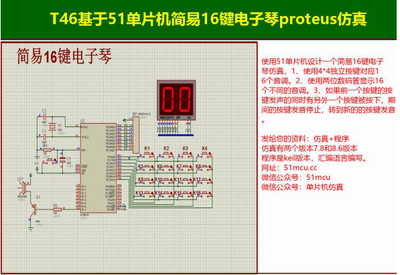 T46基于51单片机简易16键电子琴proteus仿真一、设计实现功能如下:使用51单片机设计一个简易16键电子琴仿真,1、使用4*4独立按键对应16个音调。2、使用两位数码管显示16个不...