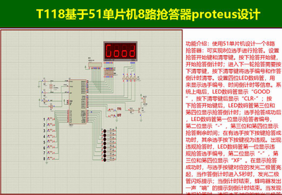T118基于51单片机8路抢答器proteus设计一、设计实现功能如下:功能介绍:使用51单片机设计一个8路抢答器:可实现8位选手进行抢答。设置抢答开始键和清零键。按下抢答开始键,...