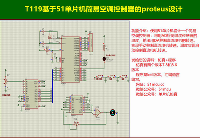 T119基于51单片机简易空调控制器的proteus设计一、设计实现功能如下:功能介绍:使用51单片机设计一个简易空调控制器:利用AD检测温度传感器的温度,输出用DA控制直流电机的...