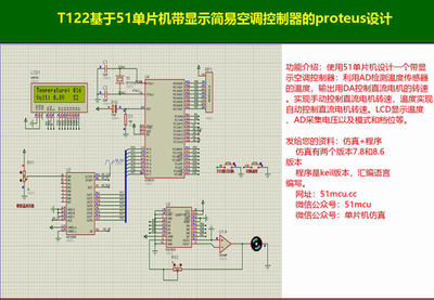 T122基于51单片机带显示简易空调控制器的proteus设计一、设计实现功能如下:功能介绍:使用51单片机设计一个带显示空调控制器:利用AD检测温度传感器的温度,输出用DA控制直...